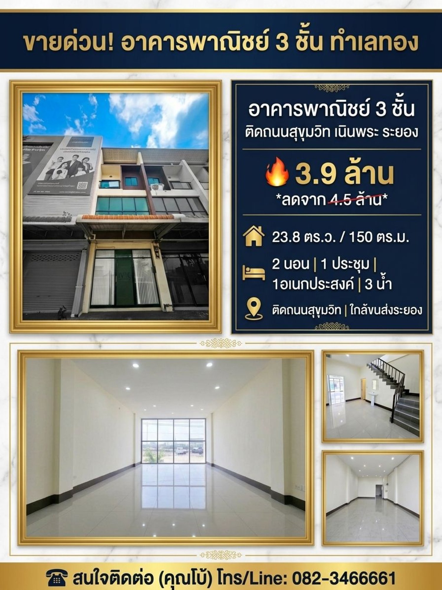 หาไม่ได้แล้วตึกแถวอาคารพาณิชย์ติดถนนสุขุมวิท !! ขายถูกตึกแถวอาคารพาณิชย์ 3 ชั้น เนินพระระยอง 23.8 ตร.วา ใช้สอย 150 ตร.ม.ทำเลคึกคัก เหมาะลงทุนและพักอาศัย !!